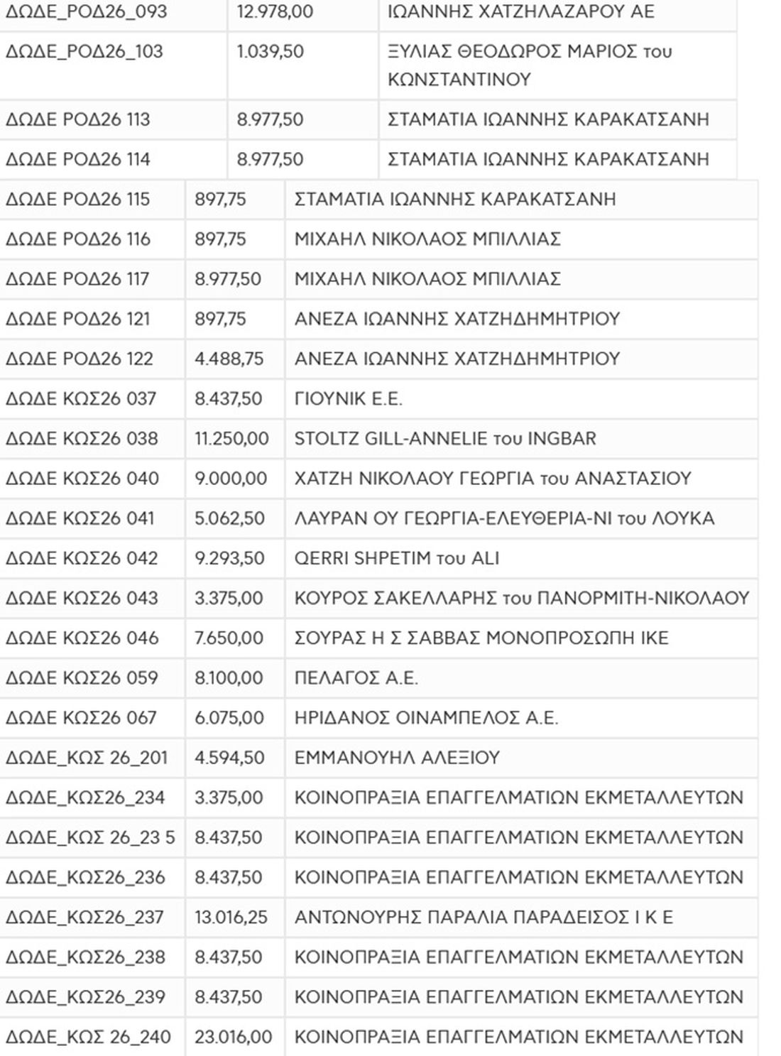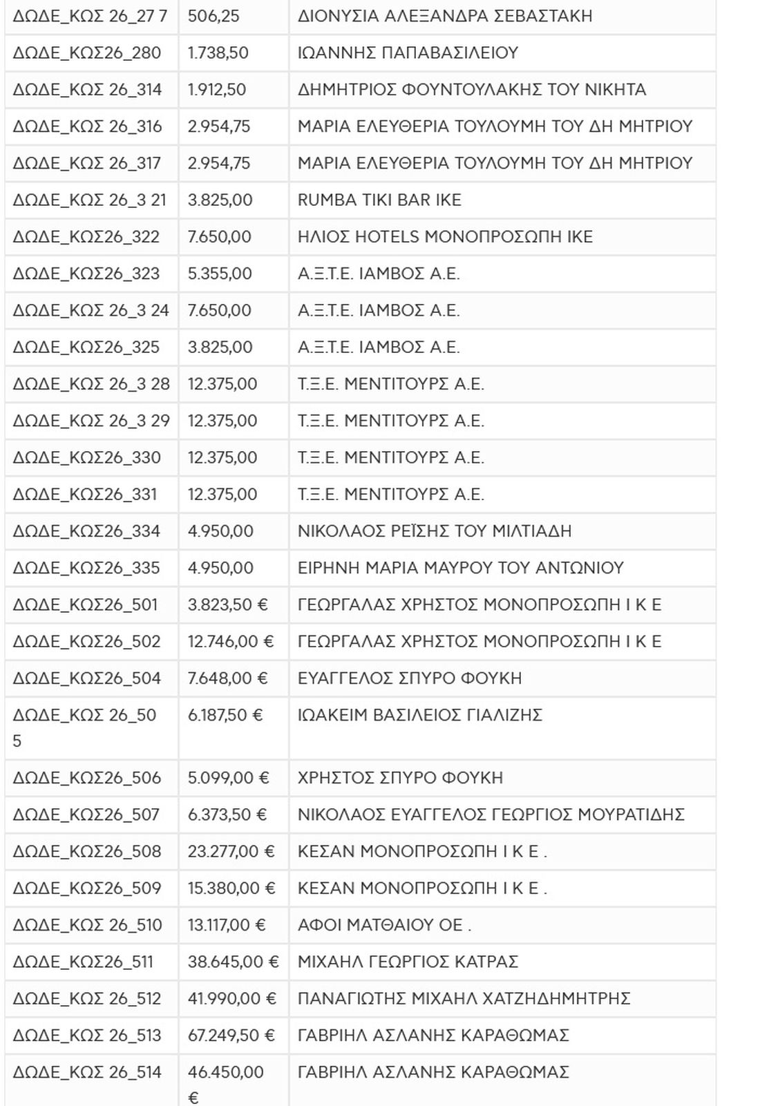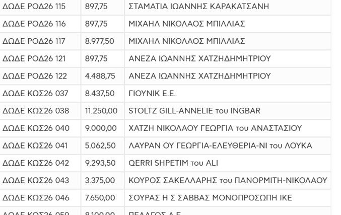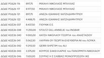 Στην Κω, η εικόνα διαφοροποιείται, καθώς υπάρχουν μεγάλες κατακυρώσεις, όπως 96.228,50 και 84.137,00, αλλά ταυτόχρονα εκτεταμένη παρουσία θέσεων με χαμηλότερα τιμήματα, δείχνοντας εύρος ενδιαφέροντος από διαφορετικούς τύπους συμμετεχόντων.