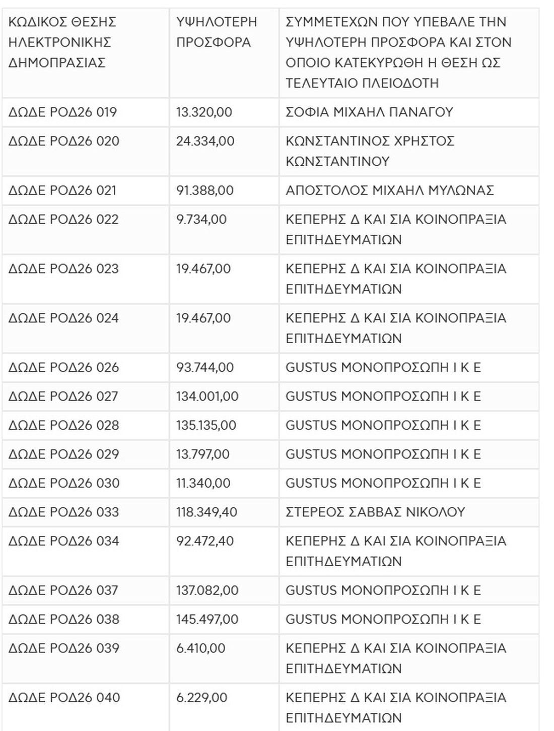 Παράλληλα με τη συγκέντρωση θέσεων, ιδιαίτερη σημασία έχουν οι κορυφαίες οικονομικές προσφορές, καθώς αντανακλούν το έντονο ενδιαφέρον για συγκεκριμένα σημεία. Στη Ρόδο καταγράφονται ιδιαίτερα υψηλές κατακυρώσεις, με προσφορά 200.272,80 σε έναν κωδικό, ενώ εμφανίζονται επανειλημμένα προσφορές άνω των 100.000 σε σειρά θέσεων, κυρίως από την ίδια εταιρεία που συγκεντρώνει και τον μεγαλύτερο αριθμό κατακυρώσεων.