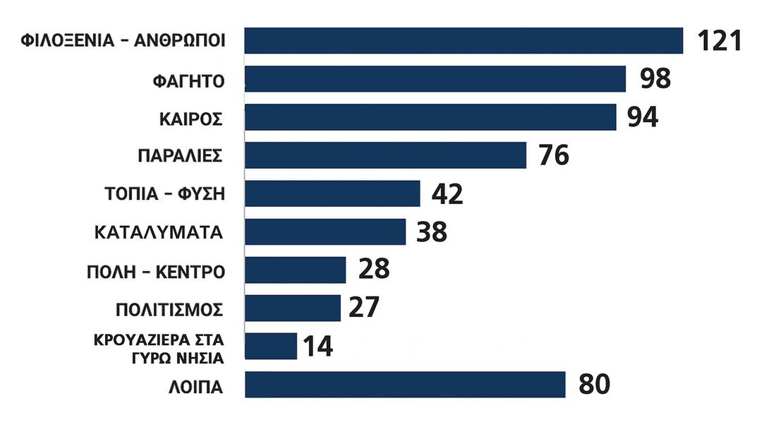 Πιο χαμηλά καταγράφονται οι απευθείας πτήσεις (18), η ιστορία – πολιτισμός (17), η φιλοξενία (15) και τα λοιπά (36), κάποια από τα οποία ήταν τα ξενοδοχεία, οι ποδηλατόδρομοι, η διαφήμιση, ο συνδυασμός ταξιδιού με την Τουρκία.