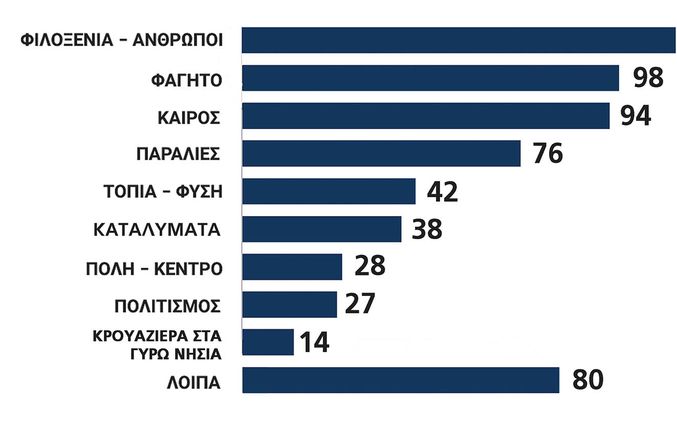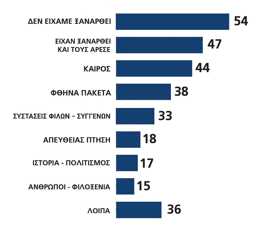 Τα φθηνά πακέτα (38) και οι συστάσεις φίλων – συγγενών (33) αναδεικνύουν τη σημασία του "από στόμα σε στόμα" και των προσιτών τιμών.