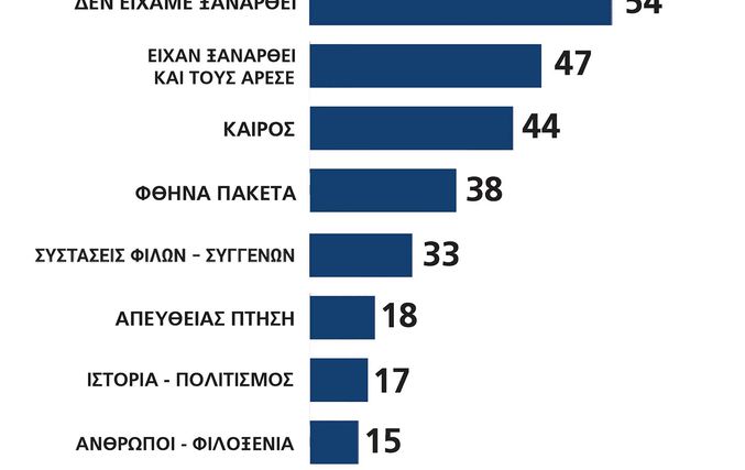 Οι λόγοι επιλογής του νησιού παραμένουν πολυδιάστατοι, συνδυάζοντας πρακτικά, συναισθηματικά και οικονομικά κριτήρια. Στην κορυφή βρίσκεται η απάντηση «Δεν είχαμε ξαναρθεί» (54), ακολουθούμενη από το «Είχαν ξαναρθεί και τους άρεσε» (47) και τον καιρό (44).