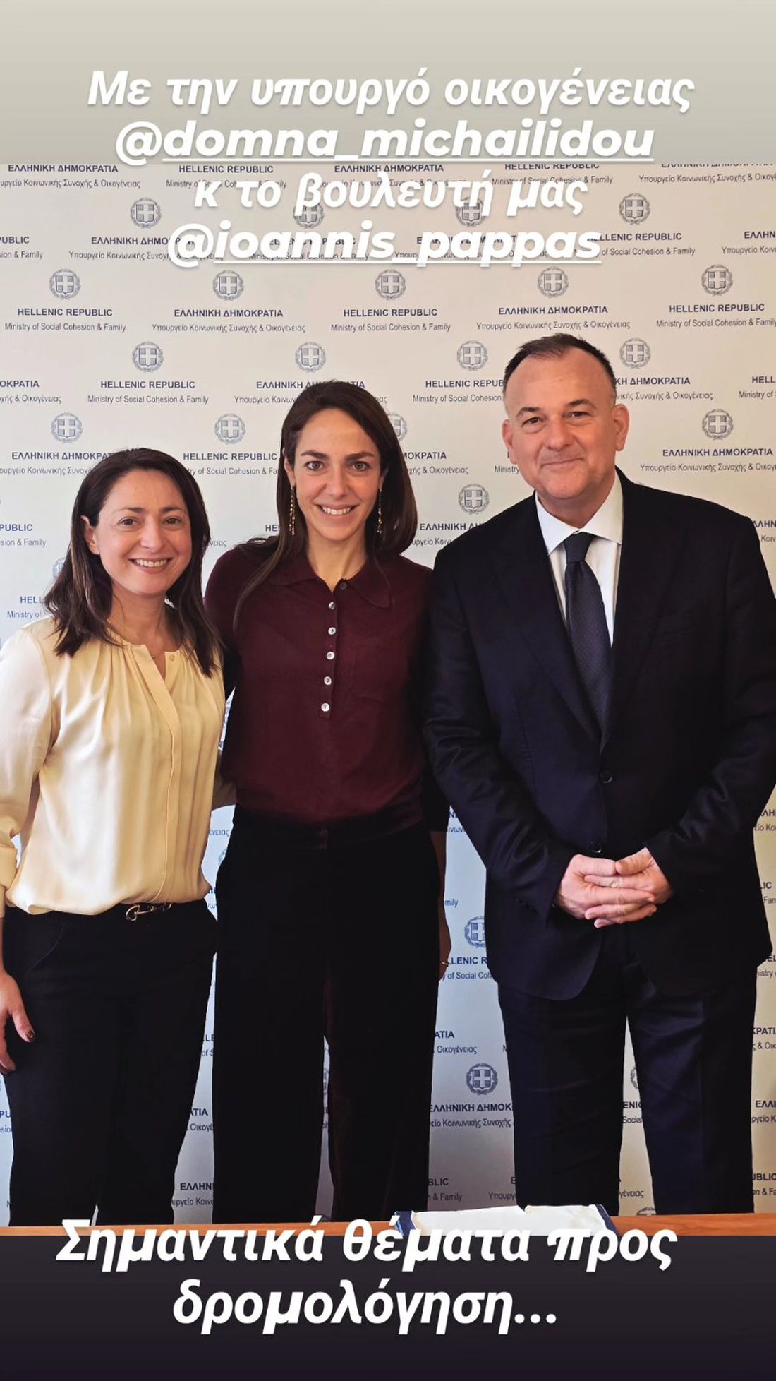 Τη Δευτέρα, 16 Φεβρουαρίου πραγματοποιήθηκε συνάντηση εργασίας με την Υπουργό Κοινωνικής Συνοχής και Οικογένειας, κα Δόμνα Μιχαηλίδου, τον Βουλευτή Δωδεκανήσου κο. Ιωάννη Παππά και τους Γενικούς Γραμματείς του Υπουργείου. Συζητήθηκαν θέματα που αφορούν τη λειτουργία του γηροκομείου «Άγιος Νεκτάριος» της Ιεράς Μητροπόλεως Κω-Νισύρου και διερευνήθηκαν τρόποι στήριξής του.