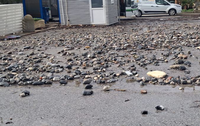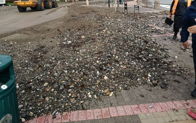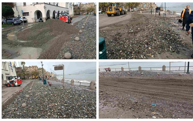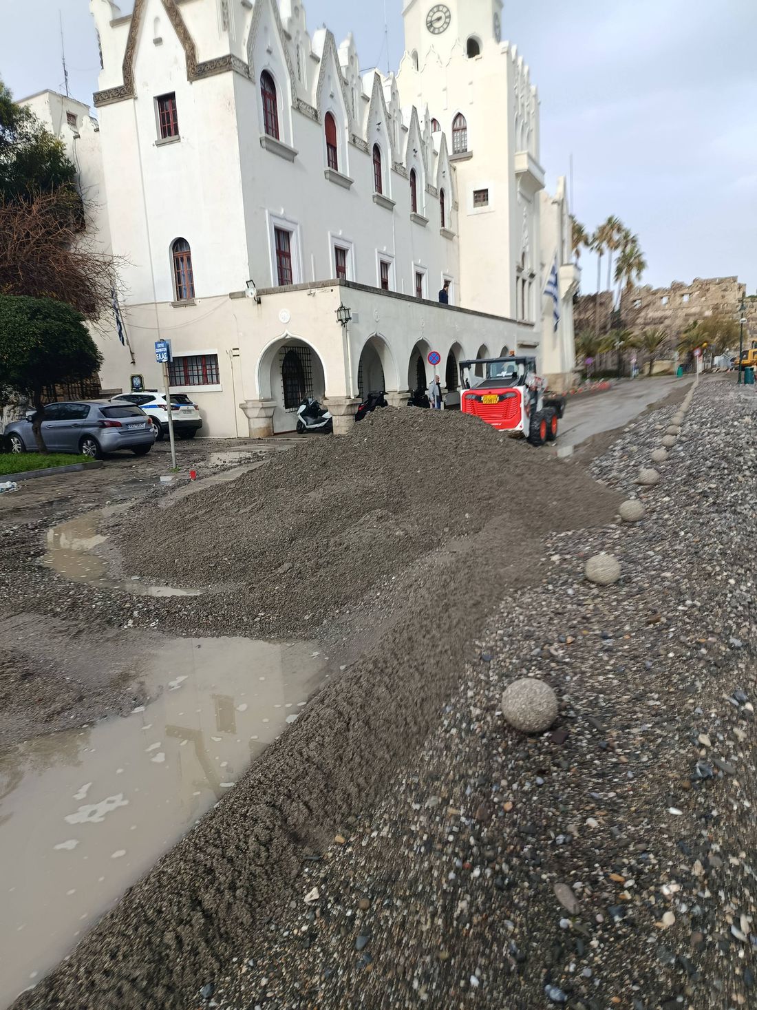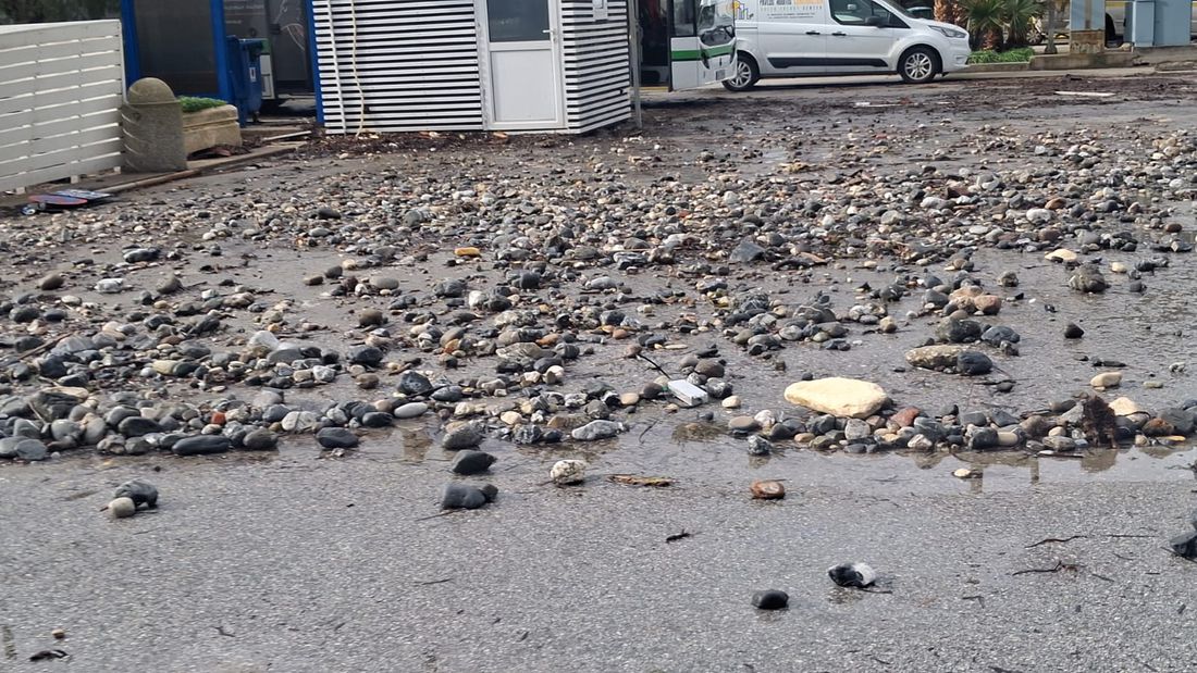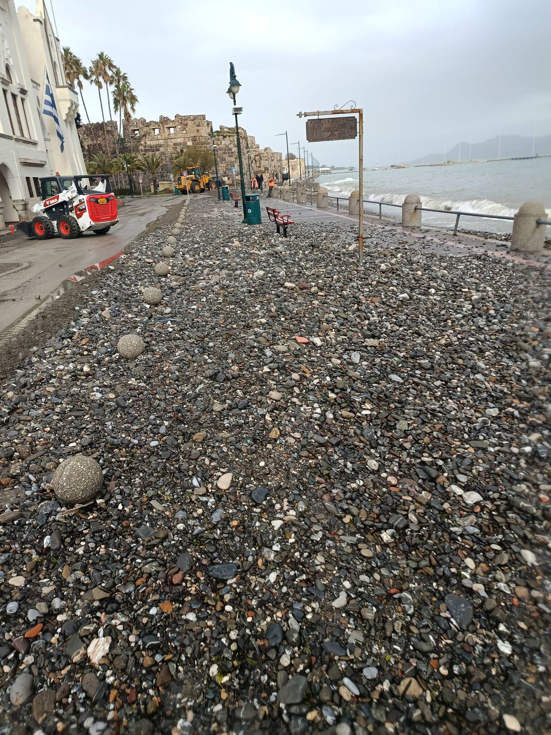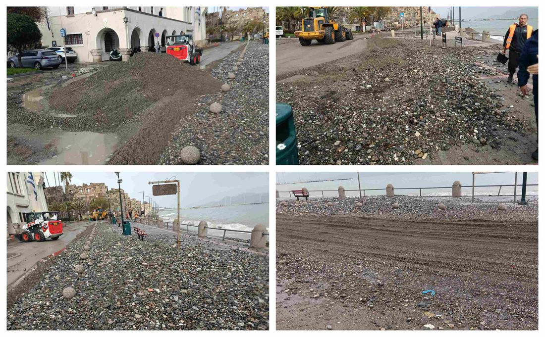 Οι θυελλώδεις άνεμοι μετέφεραν στη στεριά φερτά υλικά, με τα συνεργία να προσπαθούν να τα απομακρύνουν για να επιτραπεί και πάλι η διέλευση πεζών και οχημάτων στην περιοχή.
