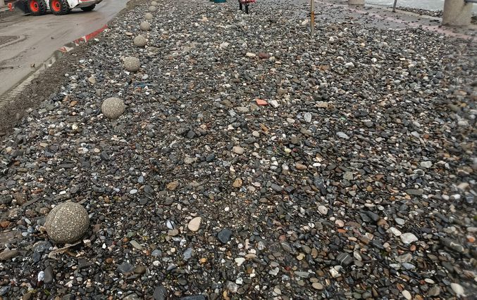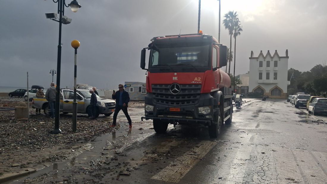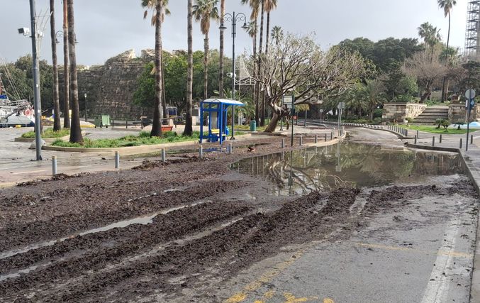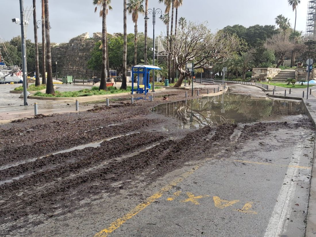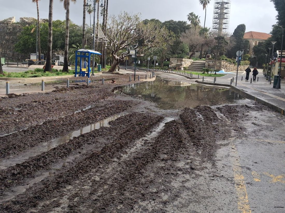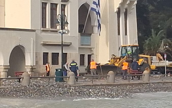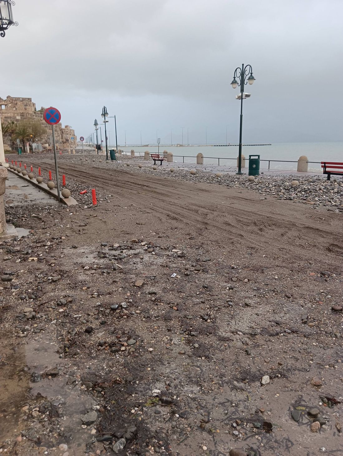 Οι θυελλώδεις άνεμοι μετέφεραν στη στεριά φερτά υλικά, με τα συνεργία να προσπαθούν να τα απομακρύνουν για να επιτραπεί και πάλι η διέλευση πεζών και οχημάτων στην περιοχή.