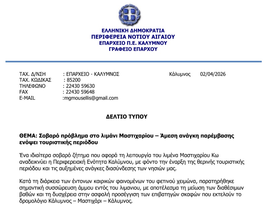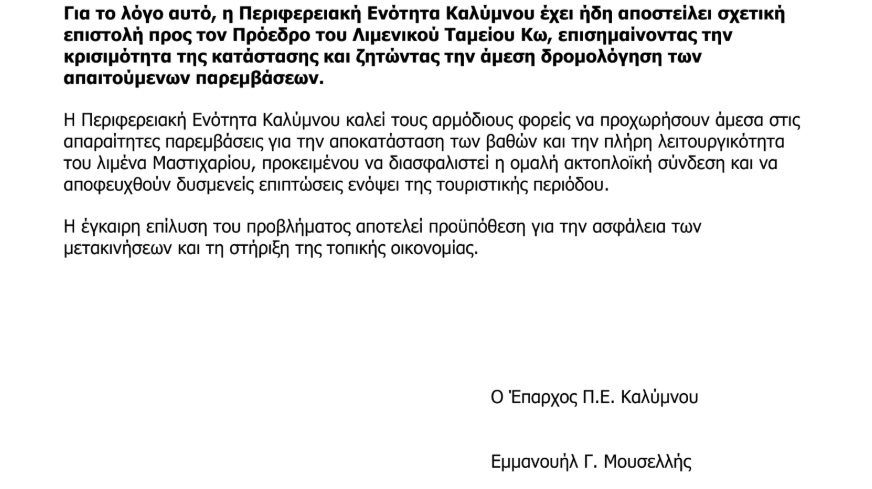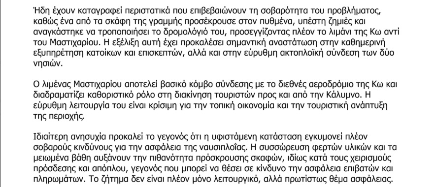 Επιστολή - παρέμβαση του Επάρχου Καλύμνου για το σοβαρό πρόβλημα στο λιμάνι Μαστιχαρίου με τα μειωμένα βάθη