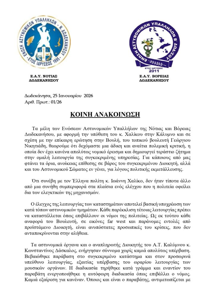Οι Ενώσεις Αστυνομικών Υπαλλήλων Β. και Ν. Δωδεκανήσου, εξέδωσαν κοινή ανακοίνωση σε σχέση με τον πρόσφατο περιστατικό με την υπόθεση του κ. Γιάννη Χαλίκου, που έλαβε χώρα στην Κάλυμνο και προκάλεσε ποικίλες αντιδράσεις στην τοπική κοινωνία.