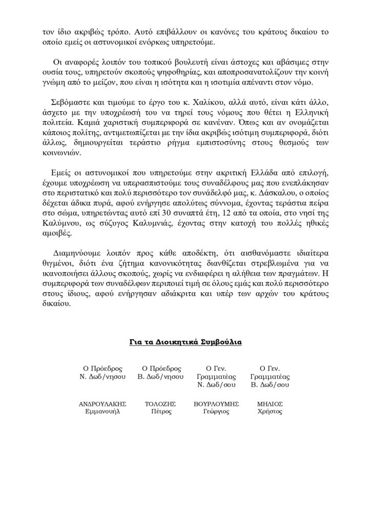 Ανακοίνωση των Ενώσεων Αστυνομικών Δωδ/σου για το πρόσφατο περιστατικό στην Κάλυμνο με τον κ. Γ. Χαλίκο