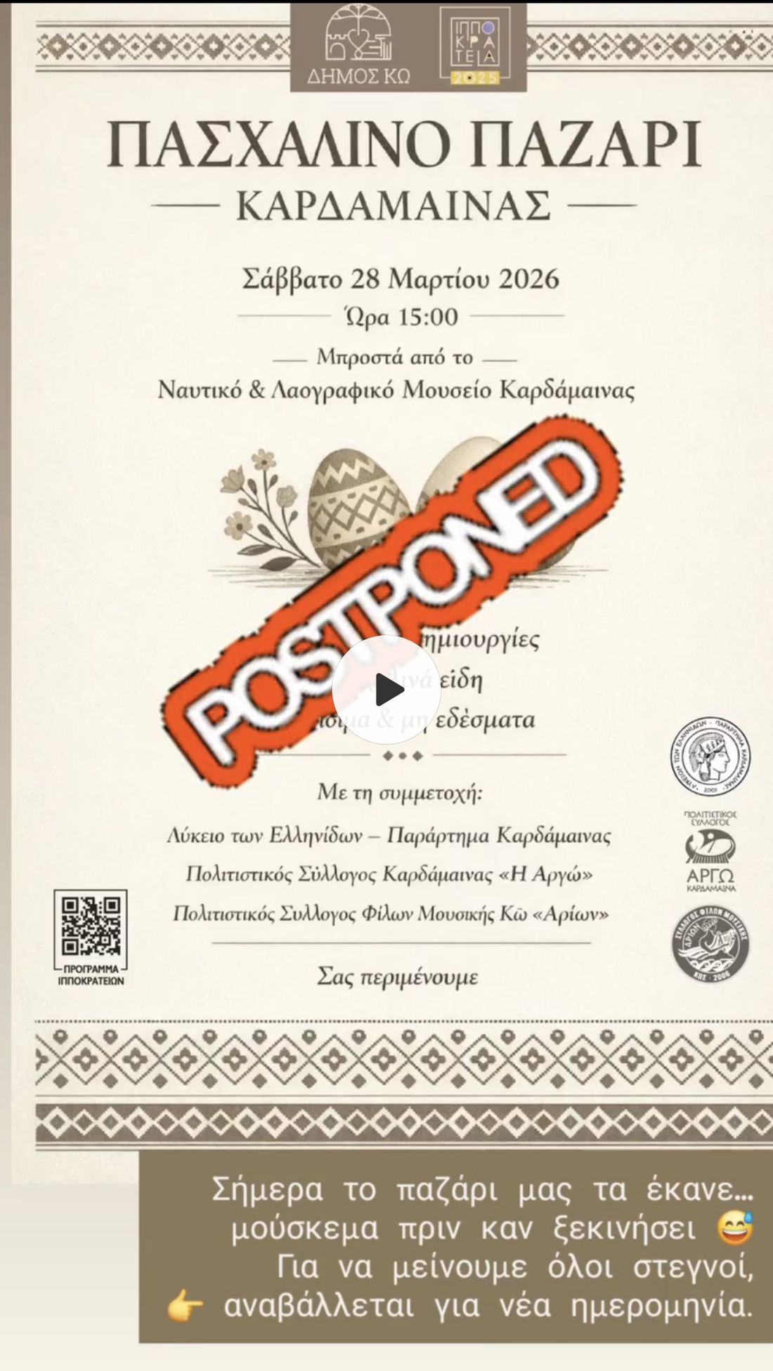 Λόγω των κακών καιρικών συνθηκών, η προγραμματισμένη εκδήλωση για το Πασχαλινό Παζάρι στην Καρδάμαινα, που ήταν προγραμματισμένη για σήμερα, Σάββατο 28 Μαρτίου 2026, αναβάλλεται.