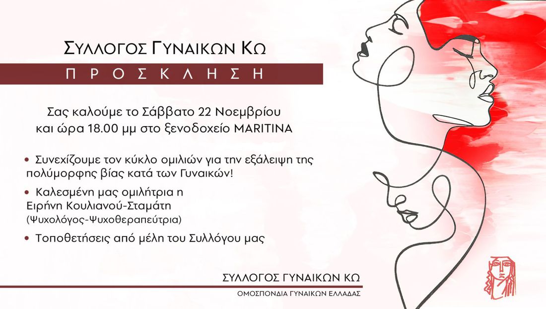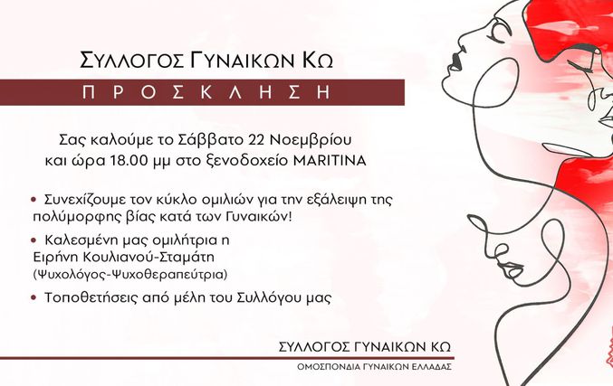 Ο Σύλλογος Γυναικών Κω σας προσκαλεί το Σάββατο 22 Νοεμβρίου, στις 18:00, στο ξενοδοχείο MARITINA, σε μια ιδιαίτερη εκδήλωση αφιερωμένη στην ενημέρωση και ευαισθητοποίηση για την εξάλειψη της πολυμορφικής βίας κατά των γυναικών.