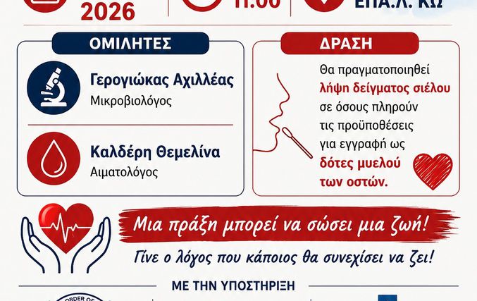 Το ΕΠΑΛ Κω διοργανώνει ενημερωτική εκδήλωση τη Δευτέρα 4 Μαΐου 2026 και ώρα 11:00 π.μ., με θέμα «Εθελοντική Αιμοδοσία και Δωρεά Μυελού των Οστών».