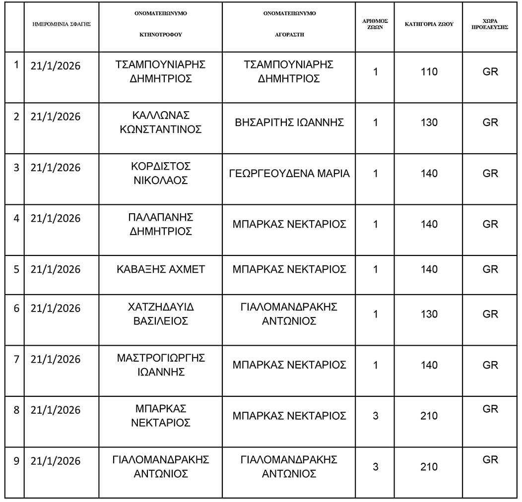 σας αποστέλλουμε πίνακα όπου απεικονίζονται αναλυτικά οι σφαγές οι οποίες έλαβαν χώρα στο Δημοτικό Σφαγείο Κω την Τετάρτη 21/1/2026.