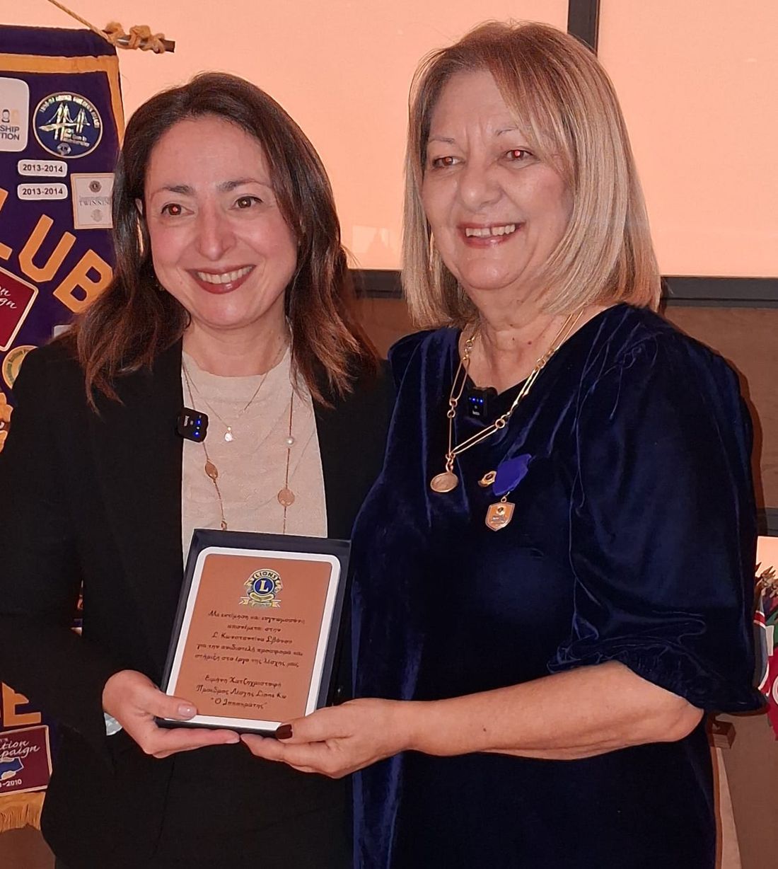 Σε μια ξεχωριστή στιγμή της βραδιάς, απονεμήθηκε συμβολική πλακέτα στην Έπαρχο και Lion Ντίνα Σβύνου, ως ένδειξη αναγνώρισης της σταθερής και πολύτιμης συμβολής της στο κοινωνικό έργο της Λέσχης.