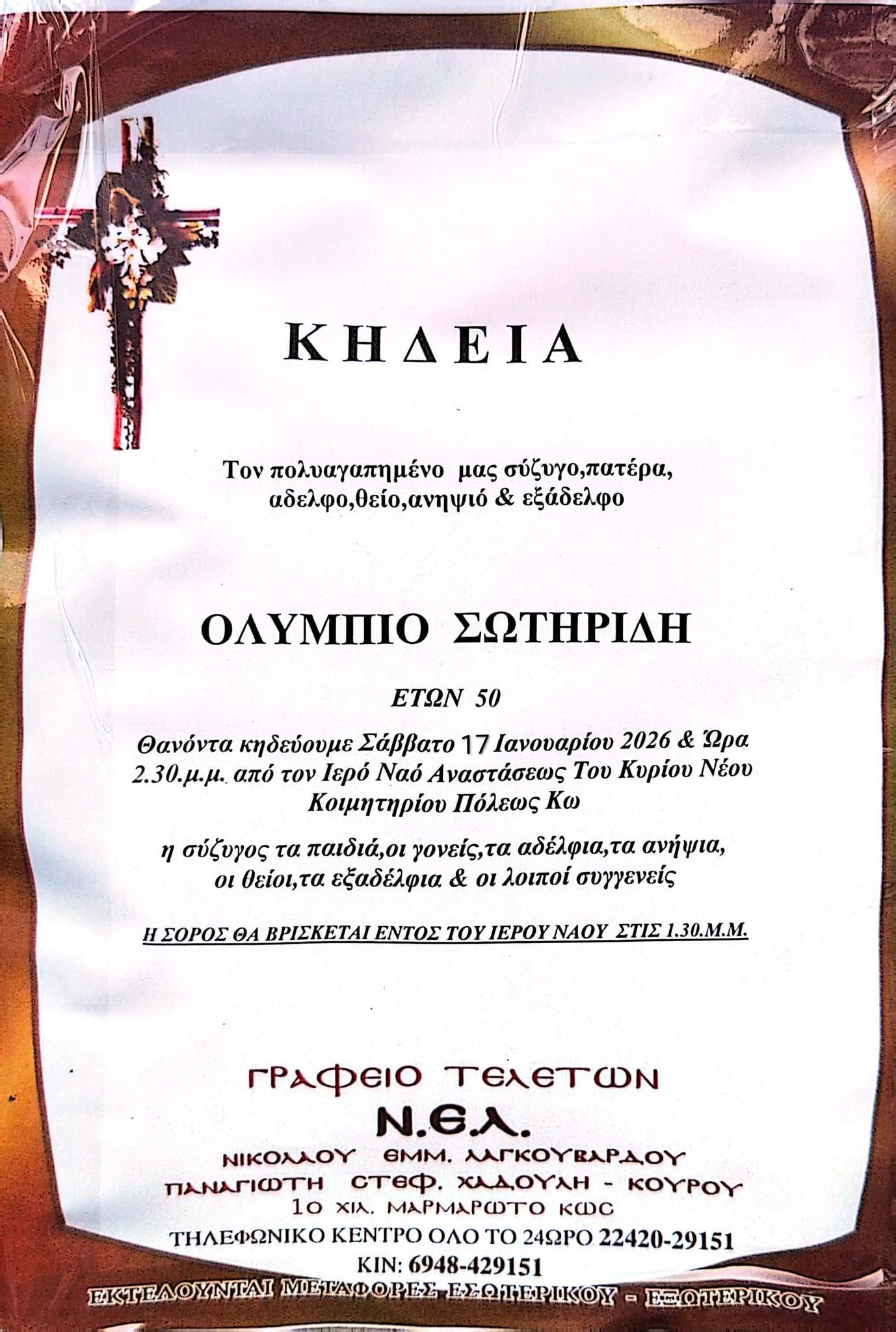 Με θλίψη και βαθιά στεναχώρια αποχαιρετάμε έναν από εμάς, έναν νέο άνθρωπο που σήμερα, μόλις στα 50 του χρόνια, ταξιδεύει για τη γειτονιά των αγγέλων, τον Ολύμπιο