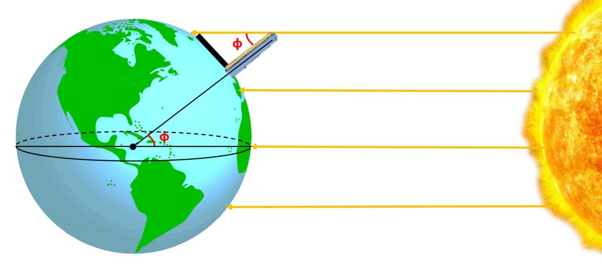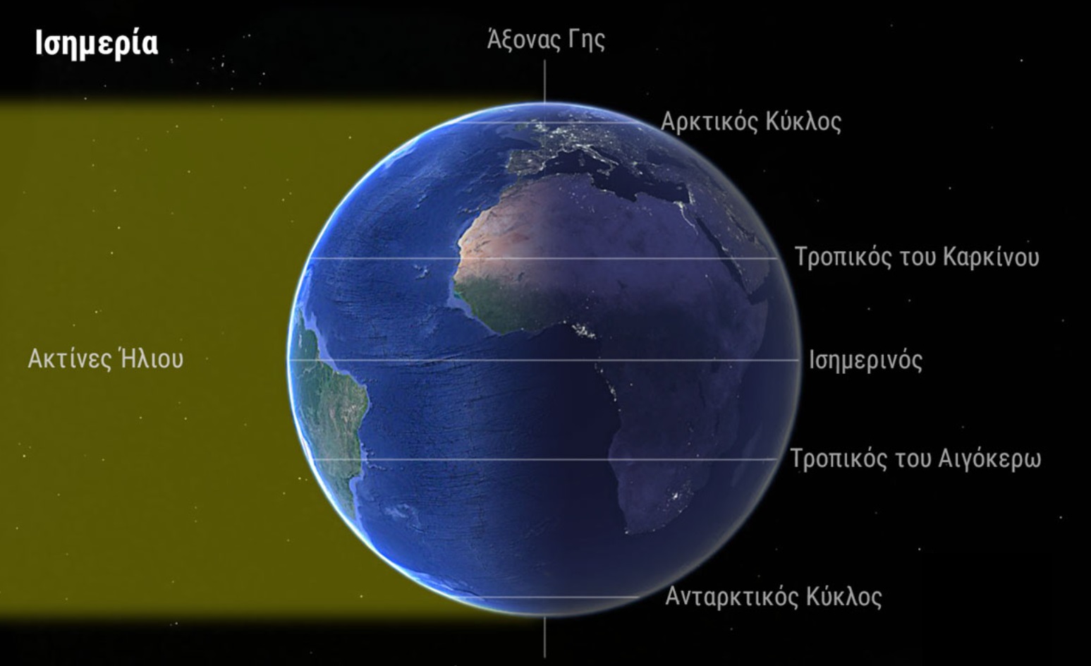 (Η εικόνα δείχνει γιατί η γωνία που σχηματίζουν οι ακτίνες του Ήλιου με την κατακόρυφο είναι ίση με το γεωγραφικό πλάτος τη στιγμή της Εαρινής Ισημερίας).