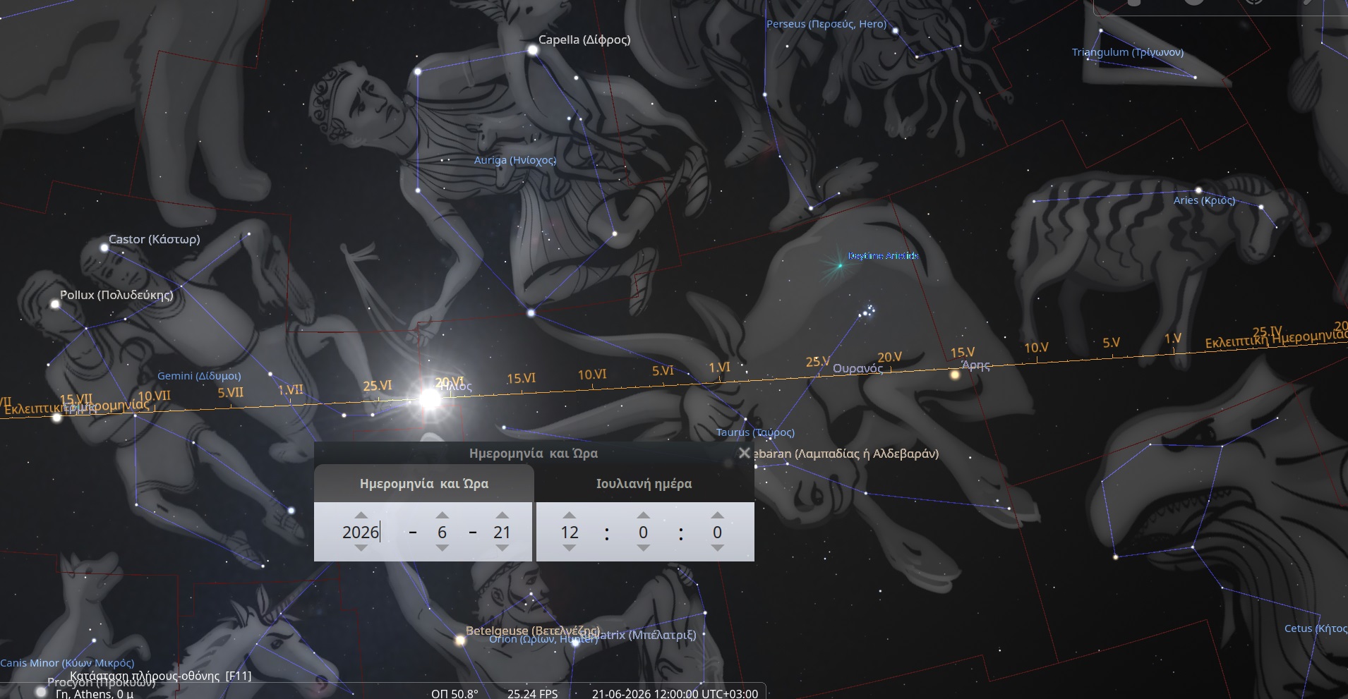 • Σήμερα (21 Ιουνίου 2026): Παρόλο που ονομάζουμε τη μέρα αυτή «είσοδο στον Καρκίνο», η αστρονομική πραγματικότητα στο Stellarium δείχνει τον Ήλιο να βρίσκεται ακόμα στα όρια μεταξύ των αστερισμών των Διδύμων και του Ταύρου.