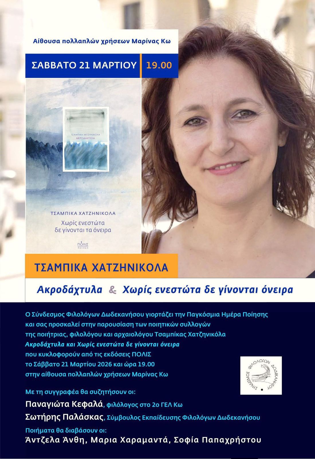 Ο Σύνδεσμος Φιλολόγων Δωδεκανήσου γιορτάζει την Παγκόσμια Ημέρα Ποίησης και σας προσκαλεί στην παρουσίαση των ποιητικών συλλογών της ποιήτριας, φιλολόγου και αρχαιολόγου ΤσαμπίκαςΧατζηνικόλα,