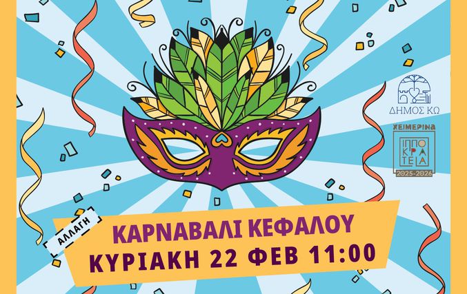 Στο πλαίσιο των Χειμερινών Πολιτιστικών εκδηλώσεων «Ιπποκράτεια 2025-26» το Τμήμα Πολιτισμού Δήμου Κω σας ενημερώνει ότι η εκδήλωση “ΚΑΡΝΑΒΑΛΙ ΣΤΗΝ ΚΕΦΑΛΟ”που ήταν προγραμματισμένη για 21 Φεβρουαρίου 2026 και ώρα 12.00 αναβάλλεται για 22Φεβρουαρίου 2026 και ώρα.11.00 λόγω καιρικών συνθηκών .