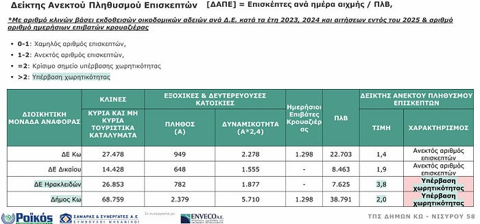 Ενδεικτικό παράδειγμα είναι ο “Δείκτης Ανεκτού Πληθυσμού Επισκεπτών με αριθμό κλινών βάσει εκδοθεισών οικοδομικών αδειών ανά Δ.Ε. κατά τα έτη 2023, 2024 και αιτήσεων εντός του 2025 & αριθμό ημερήσιων επιβατών κρουαζιέρας” (Σελίδα 58 της παρουσίασης) ο οποίος δείχνει ξεκάθαρα ότι στο 2025, έχουμε: