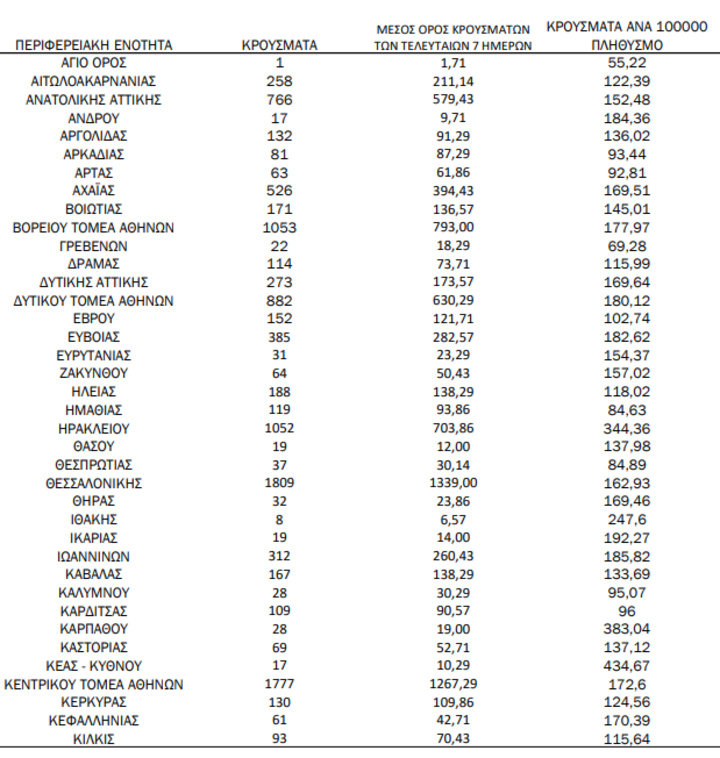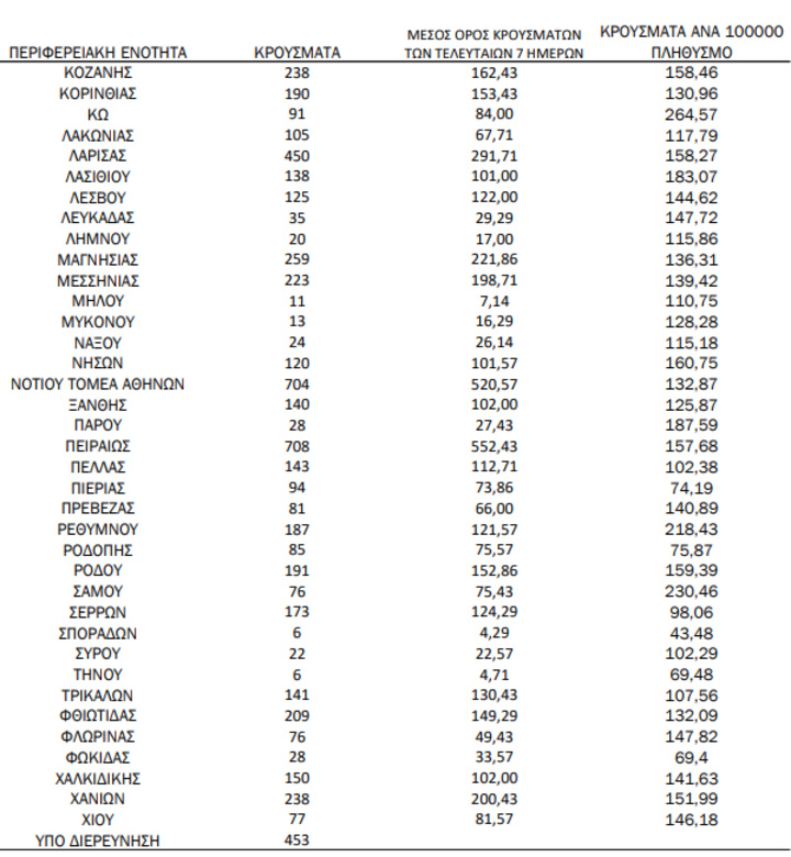 Με βάση τα επιβεβαιωμένα κρούσματα των τελευταίων 7 ημερών, 285 θεωρούνται σχετιζόμενα με ταξίδι από το εξωτερικό και 2.007 είναι σχετιζόμενα με ήδη γνωστό κρούσμα.