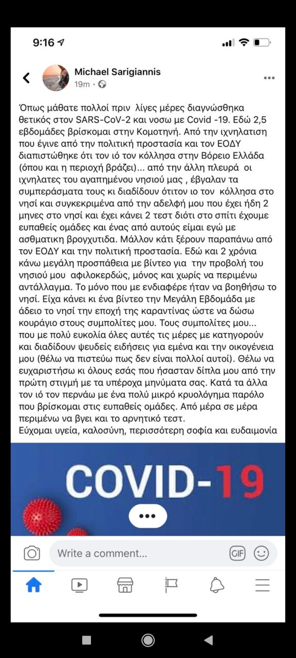 Κατόπιν ενημέρωσης από την οικογένειά. Σύμφωνα με την πολιτική  προστασία και την ιχνηλατήση που πραγματοποιήθηκε μολύνθηκε στην Κομοτηνή.