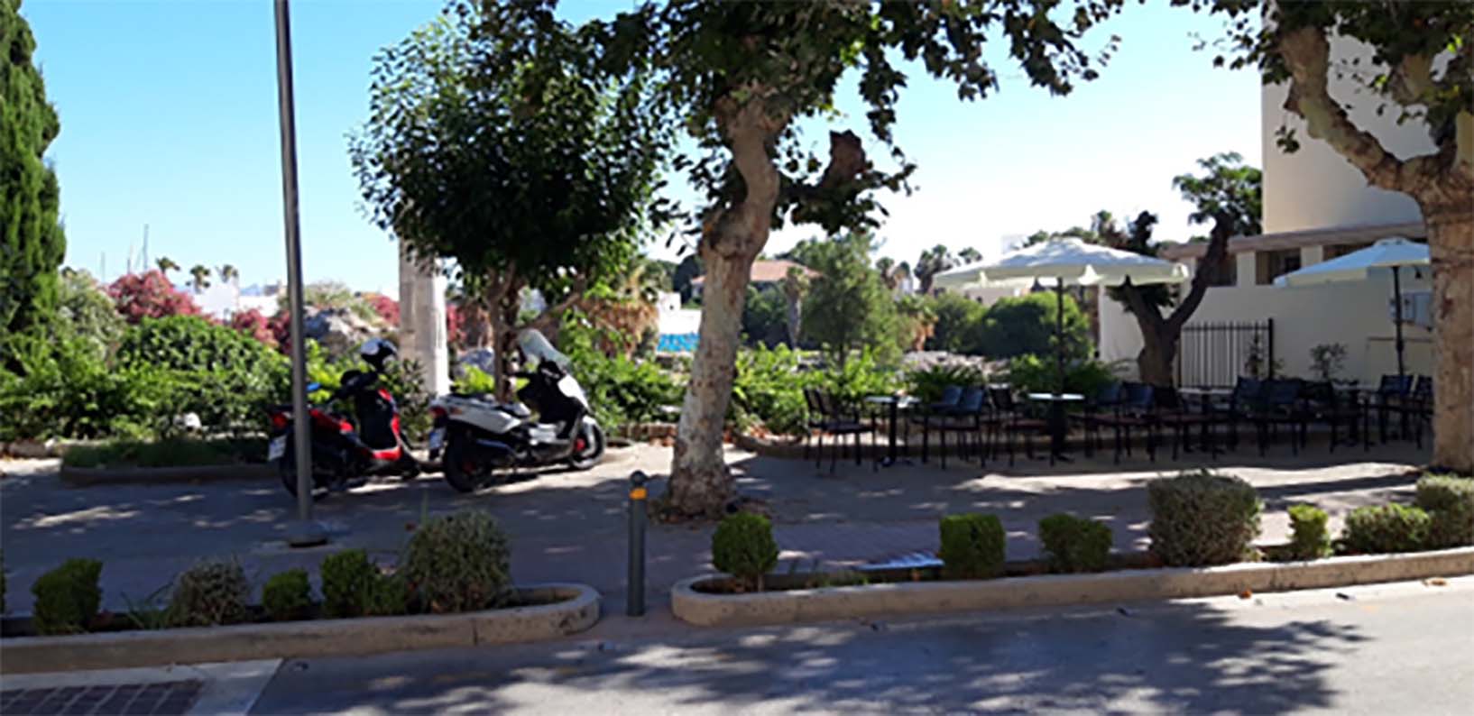 Πριν τέσσερις μήνες το ίδιο δέντρο πίσω από τις ομπρέλες. Ζει ακόμη! Ζουν και οι πικροδάφνες!