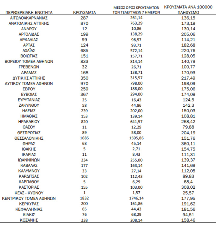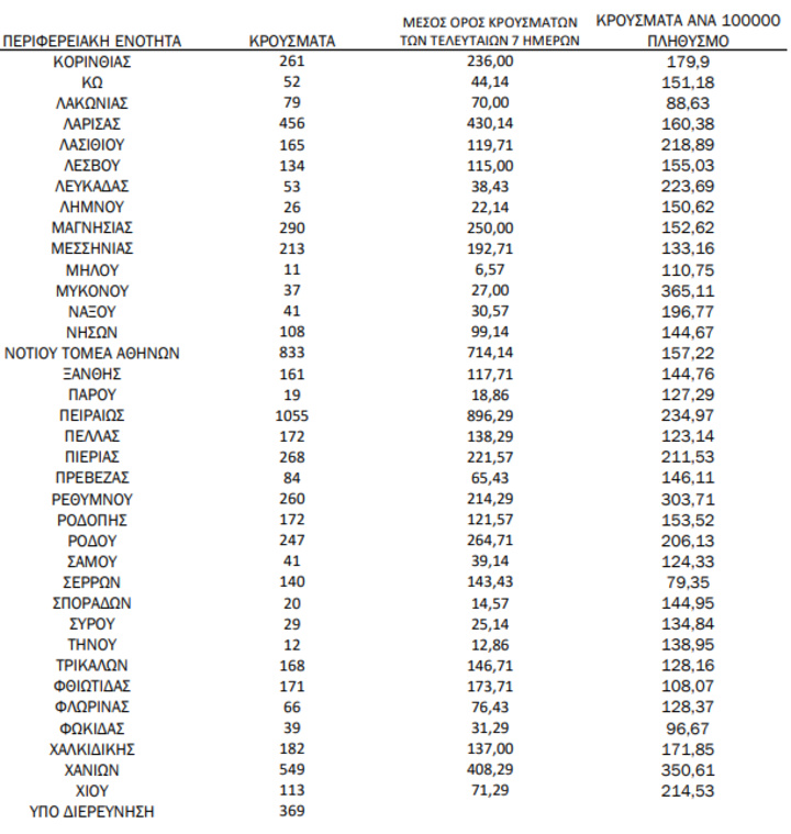Με βάση τα επιβεβαιωμένα κρούσματα των τελευταίων 7 ημερών, 473 θεωρούνται σχετιζόμενα με ταξίδι από το εξωτερικό και 2.148 είναι σχετιζόμενα με ήδη γνωστό κρούσμα.