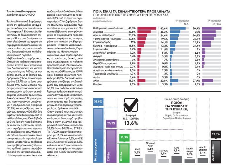 Το Αυτοδιοικητικό Βαρόμετρο της εφημερίδας «Παραπολιτικά» καταγράφει στην σημερινή του έκδοση τις απόψεις των πολιτών και τους κομματικούς συσχετισμούς στα Δωδεκάνησα.