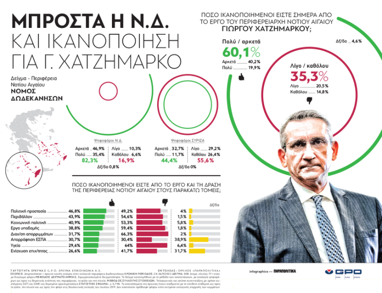 Συγκεκριμένα, η πλειοψηφία των κατοίκων της περιφέρειας δηλώνει πολύ και αρκετά ικανοποιημένη σε ποσοστό 60,1 % (58,5% ήταν το ποσοστό που κατέγραψε σε όμοια έρευνα στα Δωδεκάνησα τον Οκτώβριο του 2021) από το έργο του περιφερειάρχη Χατζημάρκου έναντι 35,3%, που εμφανίζονται λίγο ή καθόλου ευχαριστημένοι.