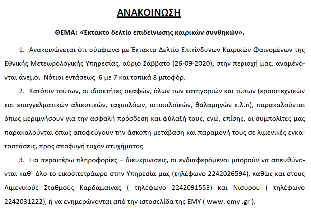 Έκτακτο δελτίο επιδείνωσης καιρικών συνθηκών από το Λιμεναρχείο Κω