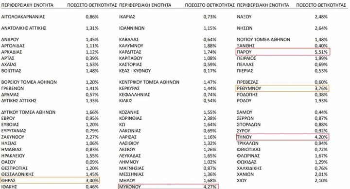 Καμπανάκι για τα νησιά Μύκονο, Τήνο και Πάρο αφού η θετικότητα κορωνοϊού υπολογίζεται σε 4,27, 4,20 και 5,10 τοις εκατό, αντίστοιχα σύμφωνα με τα νεότερα στοιχεία του ΕΟΔΥ.