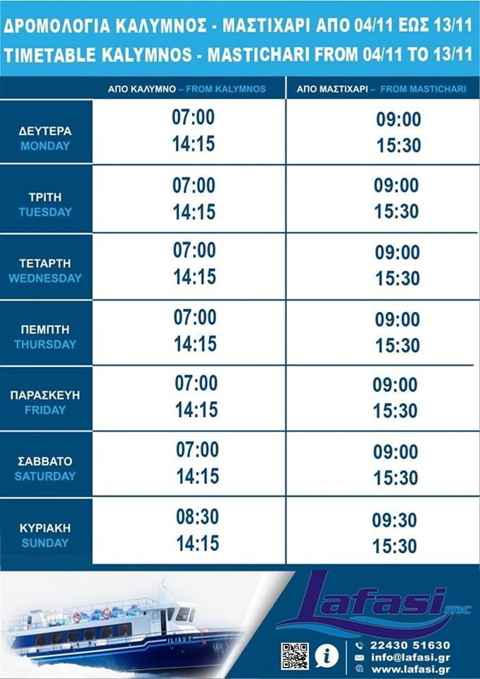 Επιπρόσθετα δρομολόγια στη γραμμή “Κάλυμνος– Μαστιχάρι” και αντίστροφα, θα εκτελούνται  από τη ΛΑΦΑΣΙ ΝΕ με το σκάφος «ΗΛΙΑΣ Τ», προκειμένου να καλυφθούν τα κενά των αντίστοιχων που εκτελούσε το «ΟΛΥΜΠΙΟΣ ΖΕΥΣ»,που έχει μεταβεί για ετήσια συντήρηση.