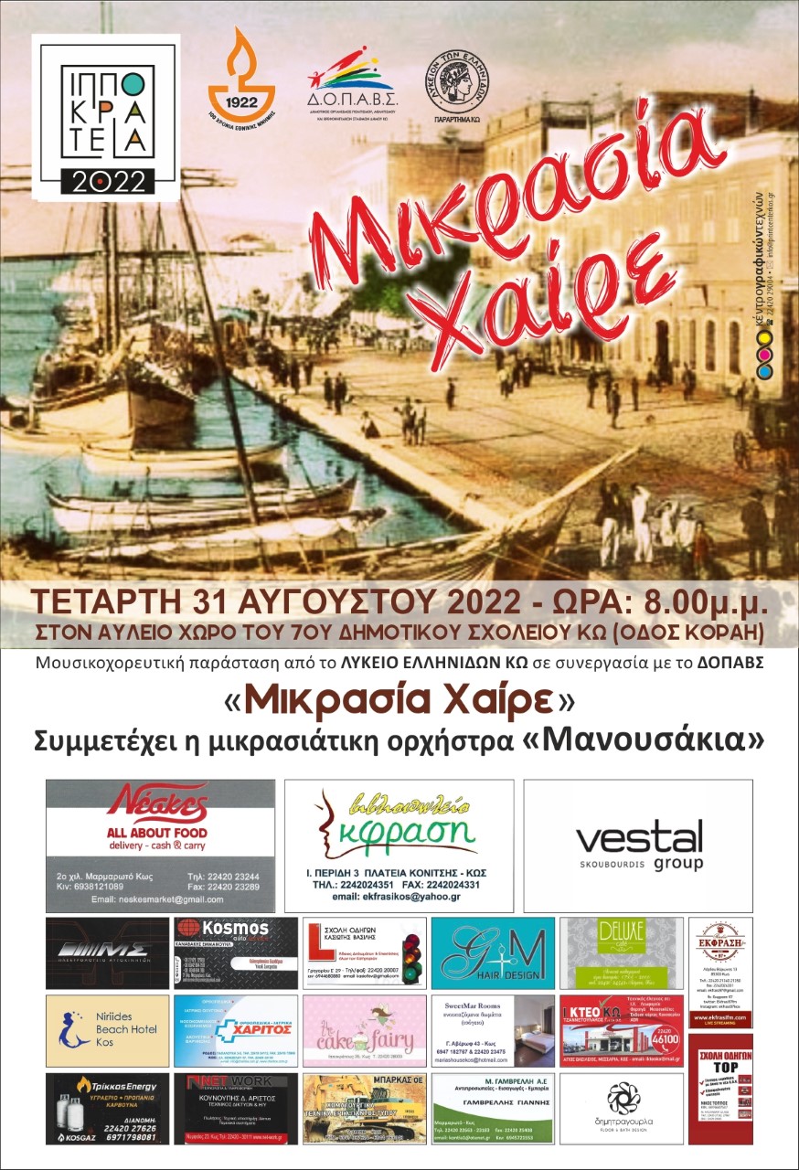 Το Λύκειο Ελληνίδων-Παράρτημα Κω με την στήριξη του ΔΟΠΑΒΣ στα πλαίσια των Θερινών Ιπποκρατείων 2022 παρουσιάζει Μουσικοχορευτική Παράσταση με τίτλο «Μικρασία Χαίρε» την Τετάρτη 31 Αυγούστου στις 20:00 στον αύλειο χώρο του 7ου Δημοτικού σχολείου Κω (είσοδος από οδό Κοραή).