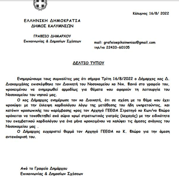 Αξιωματικός (ΥΙ) Στρατιωτικός ιατρός (βαθμός λοχαγού) ειδικότητας Καρδιολόγου , με απόφαση του Αρχηγού ΓΕΕΘΑ Κωνσταντίνου Φλώρου διατίθεται για ένα μήνα στο Νοσοκομείο Καλύμνου για την κάλυψη επιτακτικών αναγκών του . Η διάθεση του στο Νοσοκομείο Καλύμνου, ξεκινά από αύριο Τετάρτη 17 Αυγούστου 2022 και για 30 ημέρες. Ο εν λόγω ιατρός υπηρετεί σε στρατιωτική μονάδα της Ρόδου.