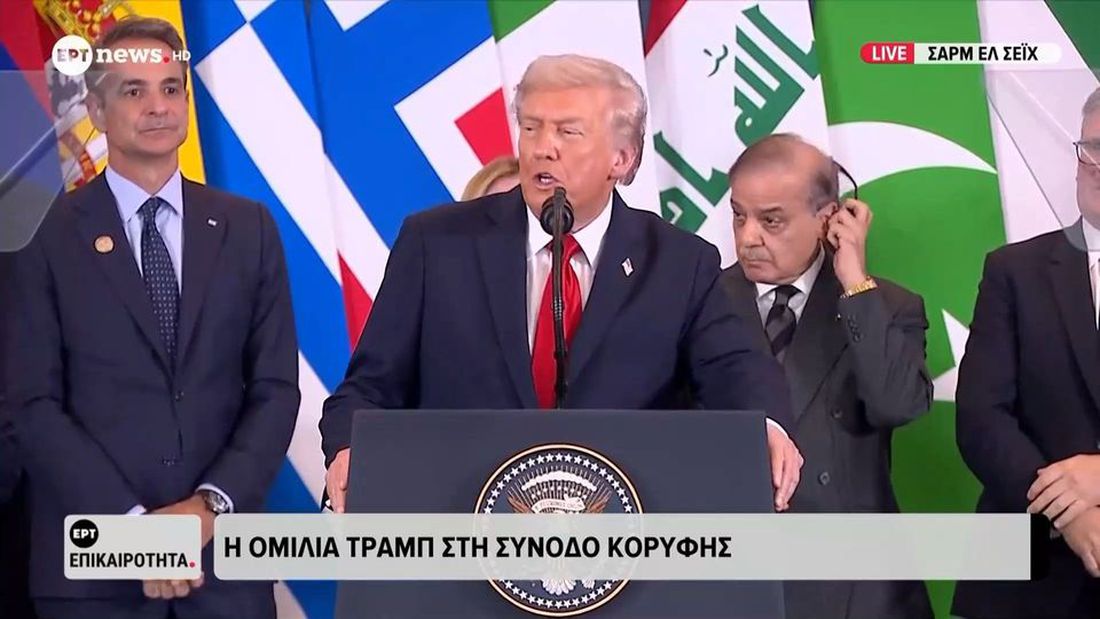 Σε μια ιστορική στιγμή, ο πρόεδρος των ΗΠΑ, Ντόναλντ Τραμπ μίλησε στην τελετή υπογραφής της ειρηνευτικής συμφωνίας για τη Μέση Ανατολή στην Αίγυπτο, έχοντας δίπλα του ηγέτες των εγγυητριών δυνάμεων Αιγύπτου, Τουρκίας και Κατάρ.