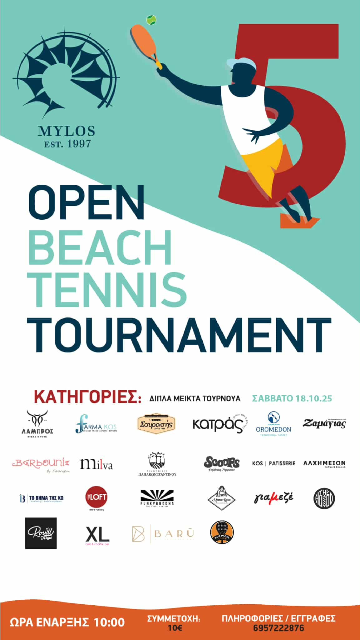 Οι φίλοι του beach tennis ετοιμάζονται για το τελευταίο μεγάλο αθλητικό ραντεβού της χρονιάς! Τo Σάββατο 18 Οκτωβρίου, στις εγκαταστάσεις του «Μύλου», θα πραγματοποιηθεί το Open Beach Tennis Tournament, ολοκληρώνοντας τη φετινή αγωνιστική περίοδο με ένα δυναμικό και άκρως θεαματικό τουρνουά.