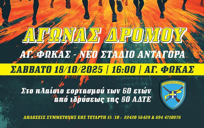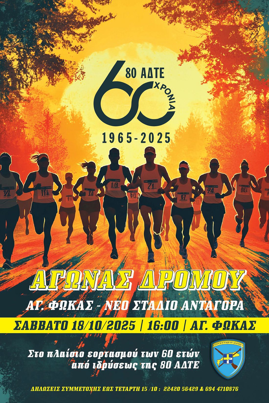 Στο πλαίσιο του εορτασμού των 60 ετών της 80 ΑΔΤΕ, τo Σάββατο 18 Οκτωβρίου και ώρα 1600, θα διεξαχθεί αγώνας δρόμου από τον Άγιο Φωκά (στρατιωτικό φυλάκιο) μέχρι το νέο δημοτικό στάδιο της Κω «ΑΝΤΑΓΟΡΑΣ».