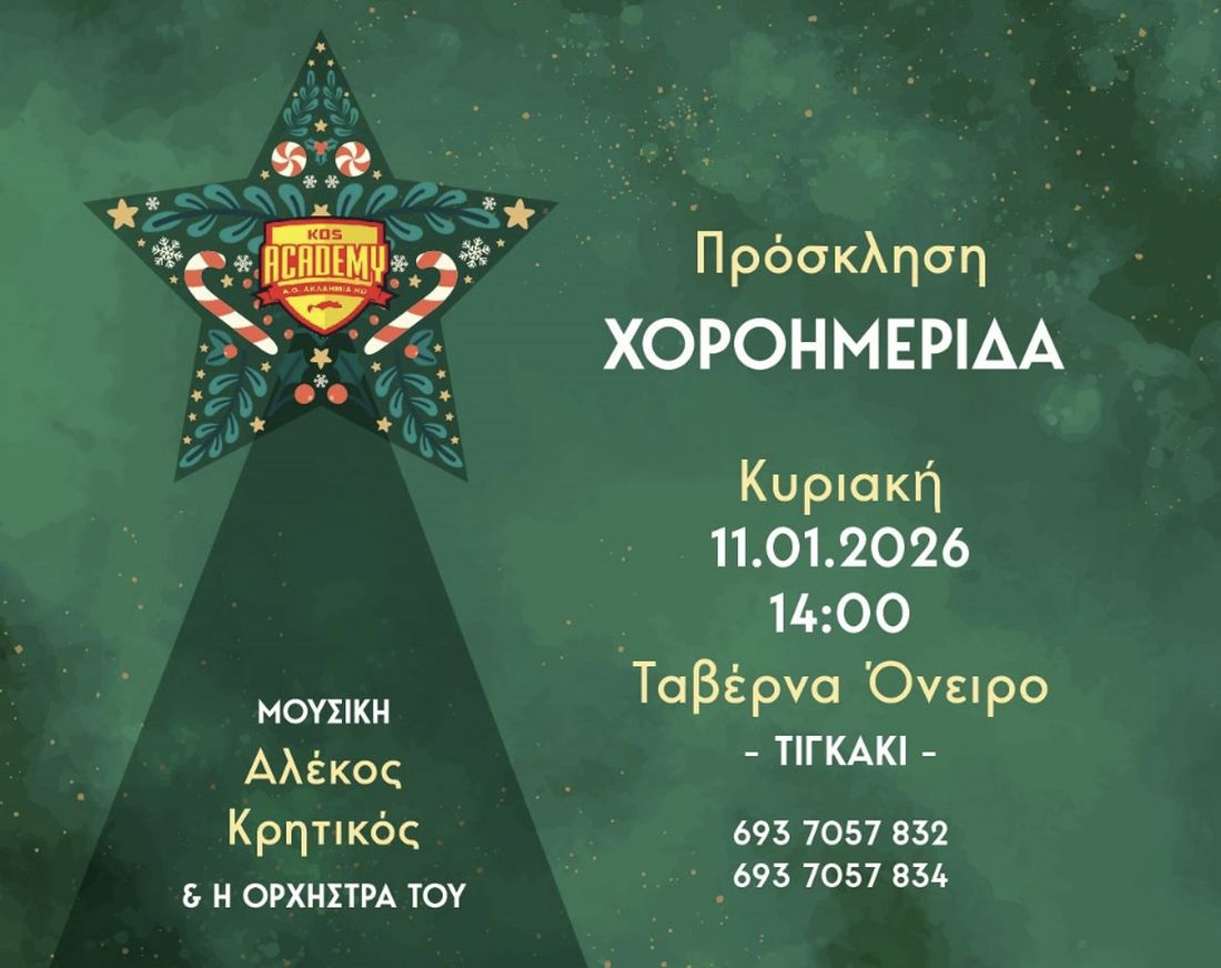 Με μία όμορφη χοροημερίδα θα γιορτάσει ο Αθλητικός Όμιλος Ακαδημία Κω την εξαιρετική αγωνιστική χρονιά που πέρασε και την έλευση του νέου έτους, κόβοντας παράλληλα την πρωτοχρονιάτικη βασιλόπιτα, στο εστιατόριο ΌΝΕΙΡΟ στο Τιγκάκι, την Κυριακή 11 Ιανουαρίου στις 14:00.