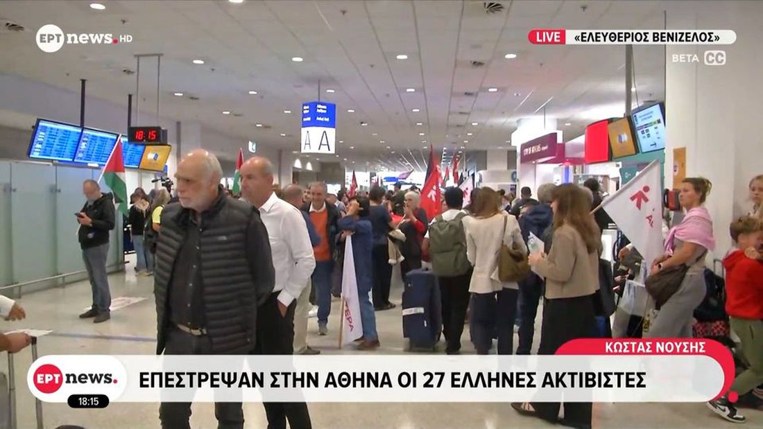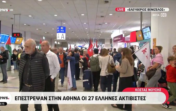 Στην Ελλάδα επέστρεψαν οι 27 Έλληνες ακτιβιστές που συμμετείχαν στον στολίσκο Global Sumud Flotilla για τη Γάζα και είχαν συλληφθεί από τις ισραηλινές αρχές. Η πτήση τσάρτερ που τους μετέφερε από το διεθνές αεροδρόμιο Eilat-Ramon προσγειώθηκε πριν από λίγο στο αεροδρόμιο «Ελευθέριος Βενιζέλος», όπου τους υποδέχθηκε πλήθος κόσμου, φίλων και συγγενών.