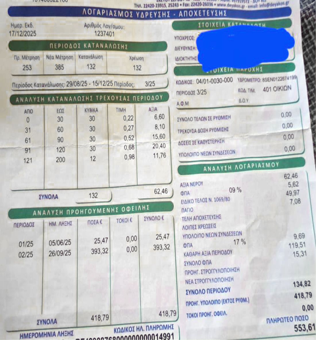 Ο κήπος έχει σύστημα ποτισμού με σταγόνες, οπότε δεν υπάρχει αλόγιστη ροή, αυλές δεν πλένουμε ούτε τα αμάξια μας κάθε μέρα. Παρακάτω βλέπετε όλες τις χρεώσεις στον λογαριασμό. Μετά από αυτόν τον λογαριασμό, παλέψαμε να μάθουμε το γιατί, κάναμε άπειρα παράπονα και μας είπαν ότι θα το συζητήσουν με τον Δήμο καθώς δεν ήμασταν οι μόνοι που λάβαμε τέτοιο παράλογο λογαριασμό. Από περίμενε σε περίμενε, ήρθε ο νέος λογαριασμός που είναι φυσιολογικός αλλά συν το προηγούμενο χρέος που προφανώς δεν ασχολήθηκε ΚΑΝΕΝΑΣ όλους αυτούς τους μήνες!