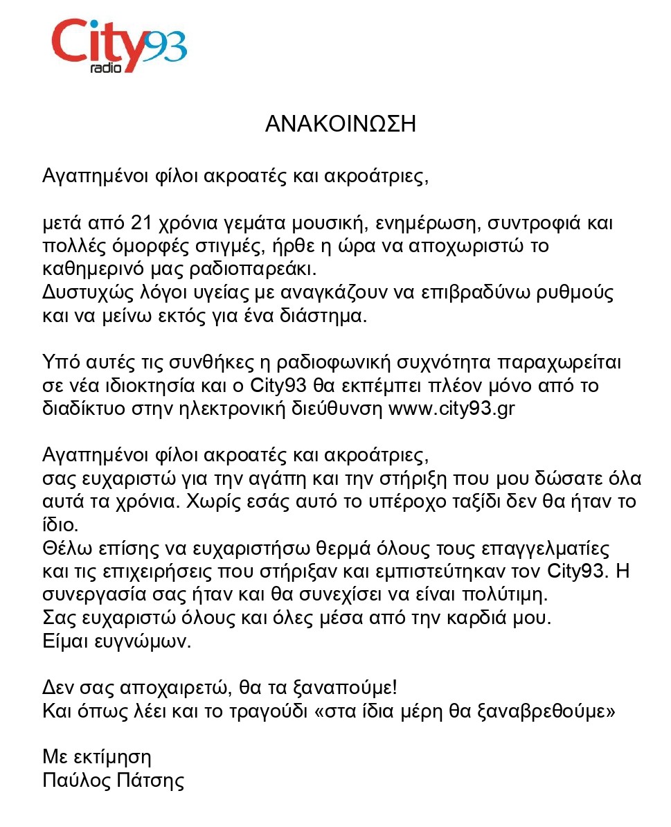 Αναφέρει επίσης, ότι η ραδιοφωνική συχνότητα 93 FM, παραχωρείται σε νέα ιδιοκτησία, ωστόσο ο ιστορικός σταθμός City 93, δεν θα "σωπάσει". Αντίθετα, συνεχίζει το ταξίδι του ψηφιακά, μέσα από τη διαδικτυακή του πλατφόρμα www.city93.gr, διατηρώντας ζωντανή την παράδοση και την ιστορία του.