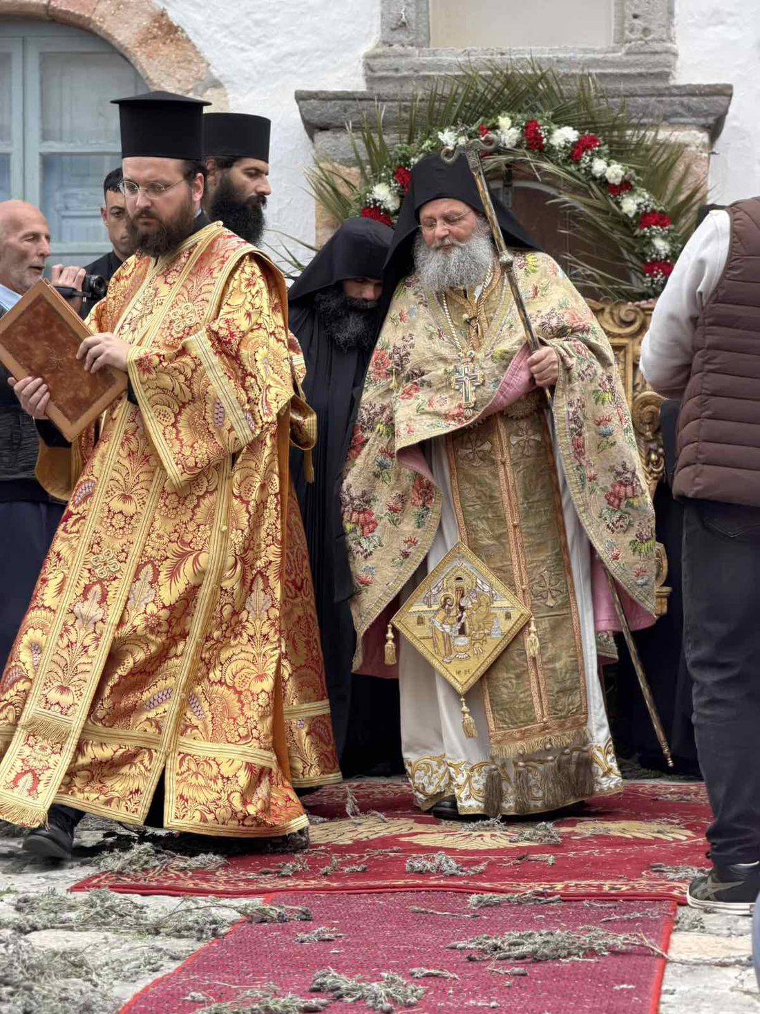 Η τελετή ξεκίνησε μετά τη Θεία Λειτουργία στη Μονή του Αγίου Ιωάννη του Θεολόγου. Η θρησκευτική πομπή, με επικεφαλής τον Καθηγούμενο της Μονής κ.κ. Κύριλλο, διέσχισε τα γραφικά καλντερίμια της Χώρας, τα οποία οι κάτοικοι είχαν στρώσει με λουλούδια και αρωματικά φυτά.