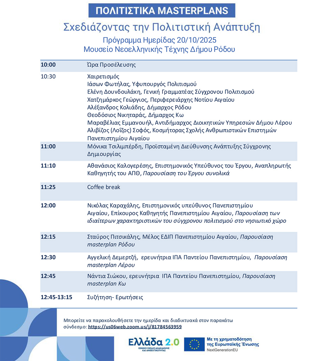Για το έργο θα μιλήσουν: Ιάσων Φωτήλας, Υφυπουργός Πολιτισμού, Ελένη Δουνδουλάκη, Γενική Γραμματέας Σύγχρονου Πολιτισμού, καθώς και πανεπιστημιακοί και ερευνητές που συμμετείχαν στο έργο.