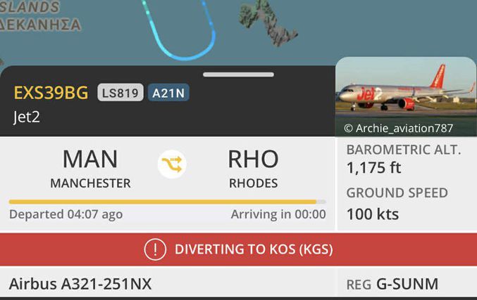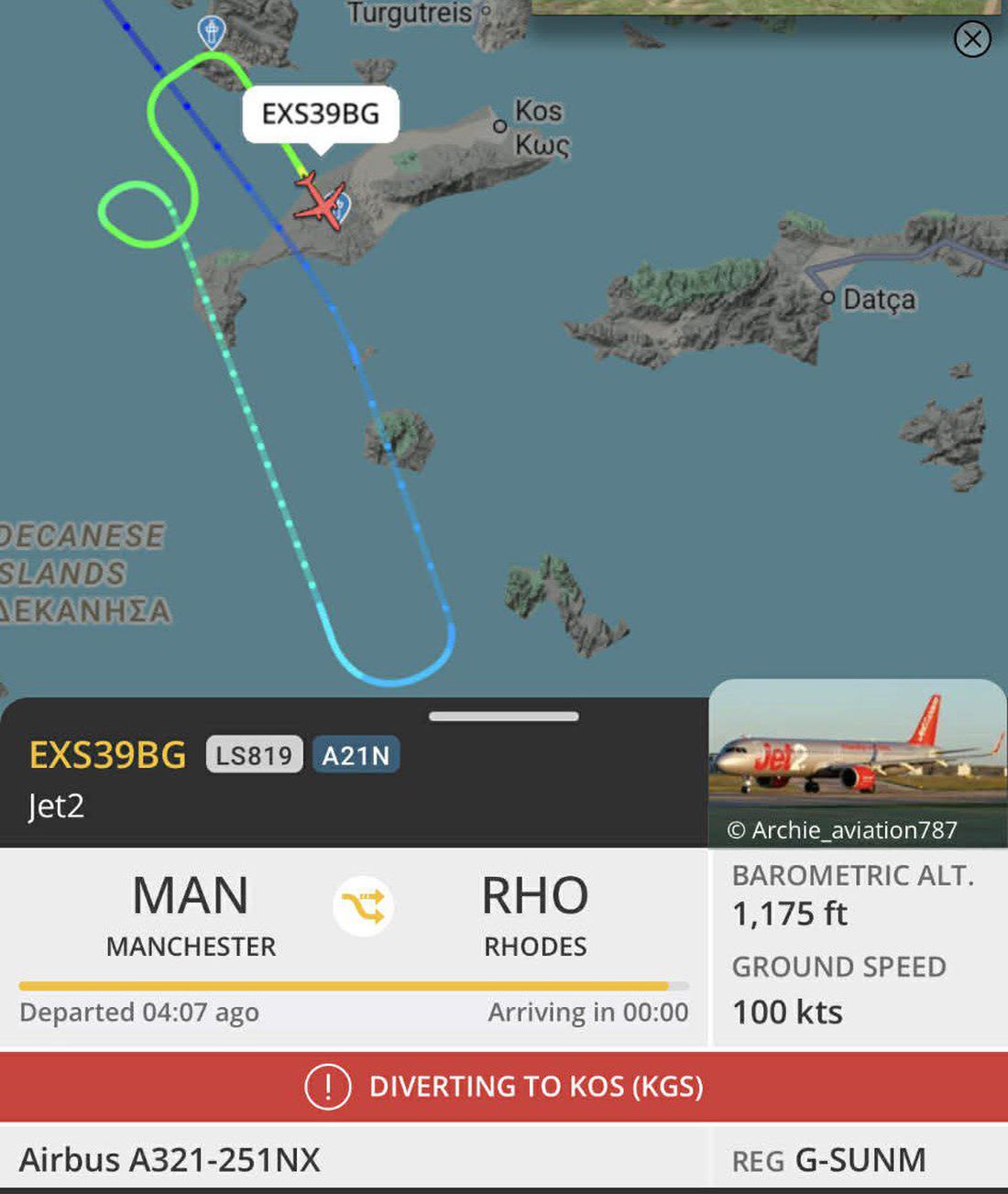 Επίσης, πριν από λίγα λεπτά, η πτήση της αεροπορικής εταιρίας jet2.com LS819 από Μάντσεστερ που επρόκειτο να προσγειωθεί στη Ρόδο με καθυστέρηση στις 17.25, πριν καν ο πιλότος πλησιάσει στο “Διαγόρας” γύρισε προς το αεροδρόμιο “Ιπποκράτης” της Κω όπου και προσγειώθηκε.