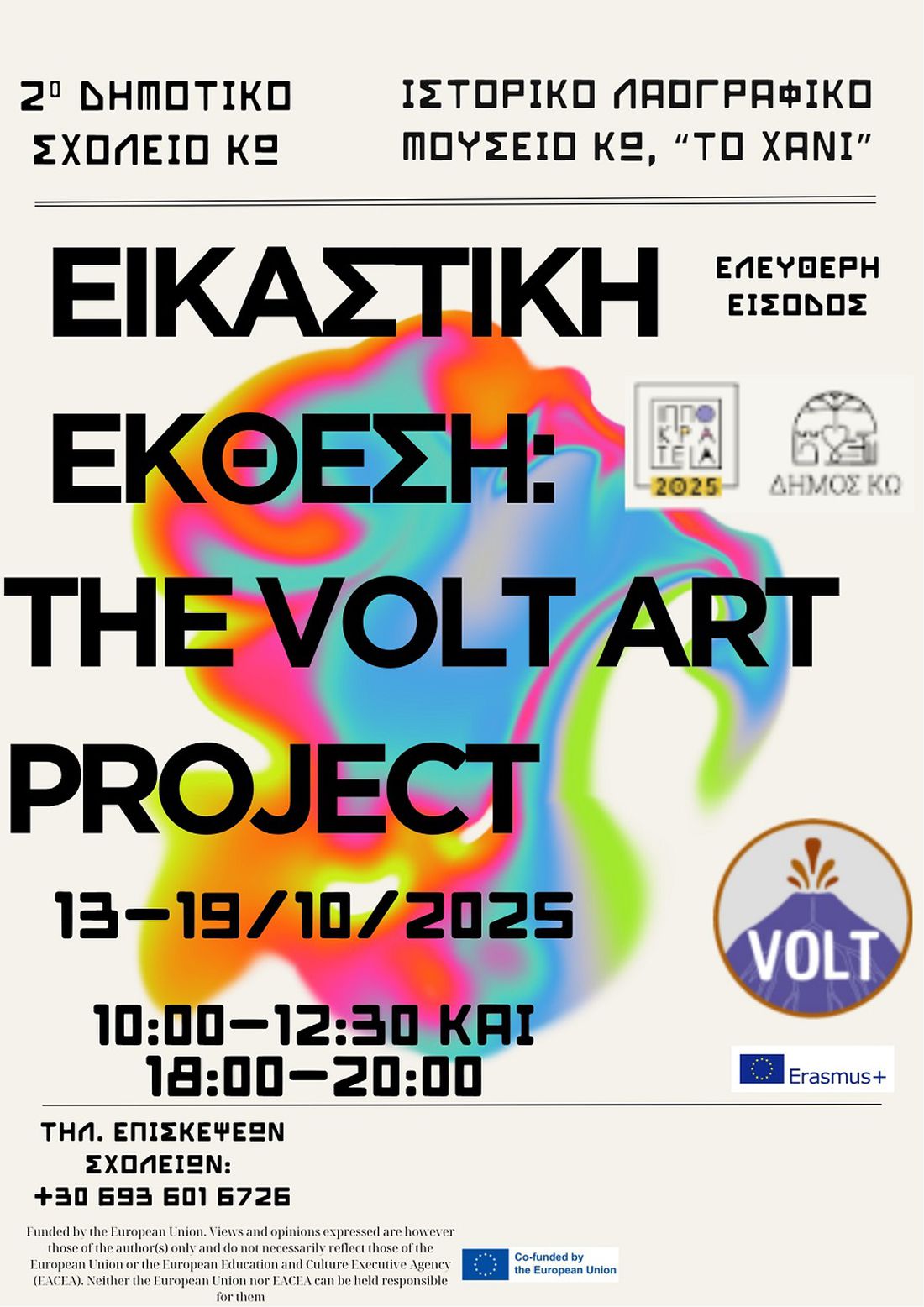 Το 2ο Δημοτικό Σχολείο Κω, στα πλαίσια του Ευρωπαϊκού προγράμματος Erasmus+ VOLT-Volcanoes As Teachers , ("Τα Ηφαίστεια ως Δάσκαλοι"), σας προσκαλεί στην εικαστική έκθεση με θέμα τα ηφαίστεια της Κω και Νισύρου με τίτλο "THE VOLT ART PROJECT", η οποία θα πραγματοποιηθεί στο Ιστορικό Λαογραφικό Μουσείο "Χάνι".