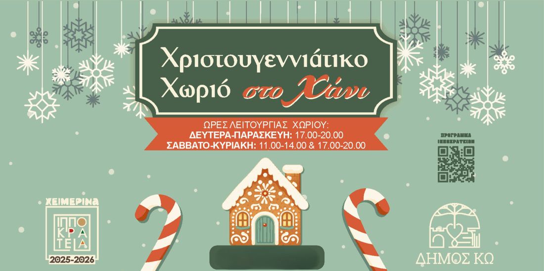 Στο πλαίσιο των Χειμερινών Πολιτιστικών Εκδηλώσεων «Ιπποκράτεια 2025-26» και της Λειτουργίας του ΧΡΙΣΤΟΥΓΕΝΝΙΑΤΙΚΟΥ ΧΩΡΙΟΥ στο Ιστορικό-Λαογραφικό Μουσείο Κω-«Χάνι», το Τμήμα Πολιτισμού Δήμου Κω σας ενημερώνει ότι λόγω της απώλειας της συμπολίτισσάς μας, εκπαιδευτικού Δρόσης Τζέκου δεν θα πραγματοποιηθούνοιεξής δράσεις:
