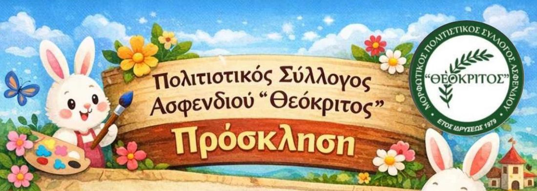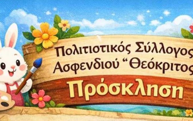 Ο Μορφωτικός πολιτιστικός σύλλογος Ασφενδιού Θεόκριτος σας προσκαλεί το Σάββατο 4 Απριλίου σ’ ένα ανοιξιάτικο απόγευμα με πασχαλινές δημιουργίες και αναβίωση εθίμων στο Θεατράκι της Ευαγγελίστριας στις 17.00 το απόγευμα. Οι δημιουργίες περιλαμβάνουν βάψιμο αυγών, κατασκευή πασχαλινών λαμπάδων και σταυρουδάκια από βάγια.