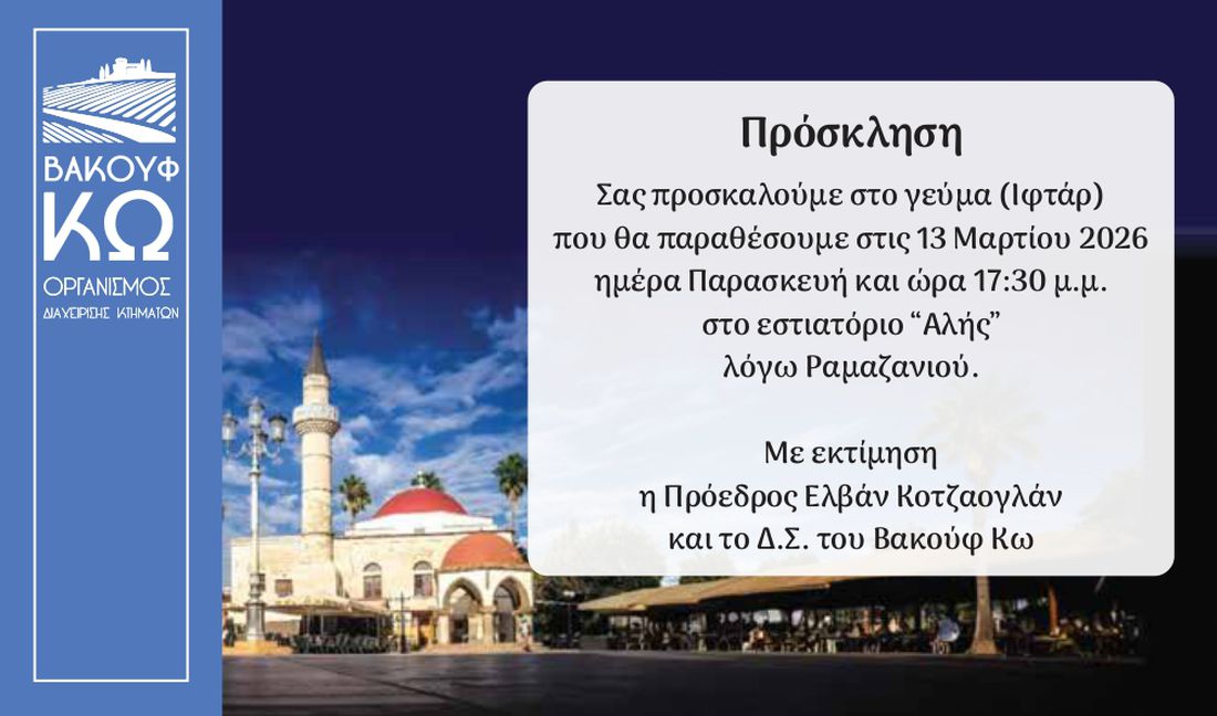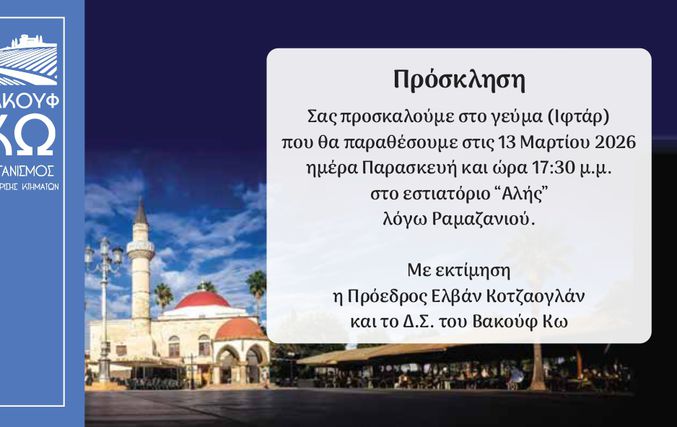 Σας προσκαλούμε στο γεύμα (Ιφτάρ) που θα παραθέσουμε στις 13 Μαρτίου 2026 ημέρα Παρασκευή και ώρα 17:30 μ.μ. στο εστιατόριο “Αλής” λόγω Ραμαζανιού.