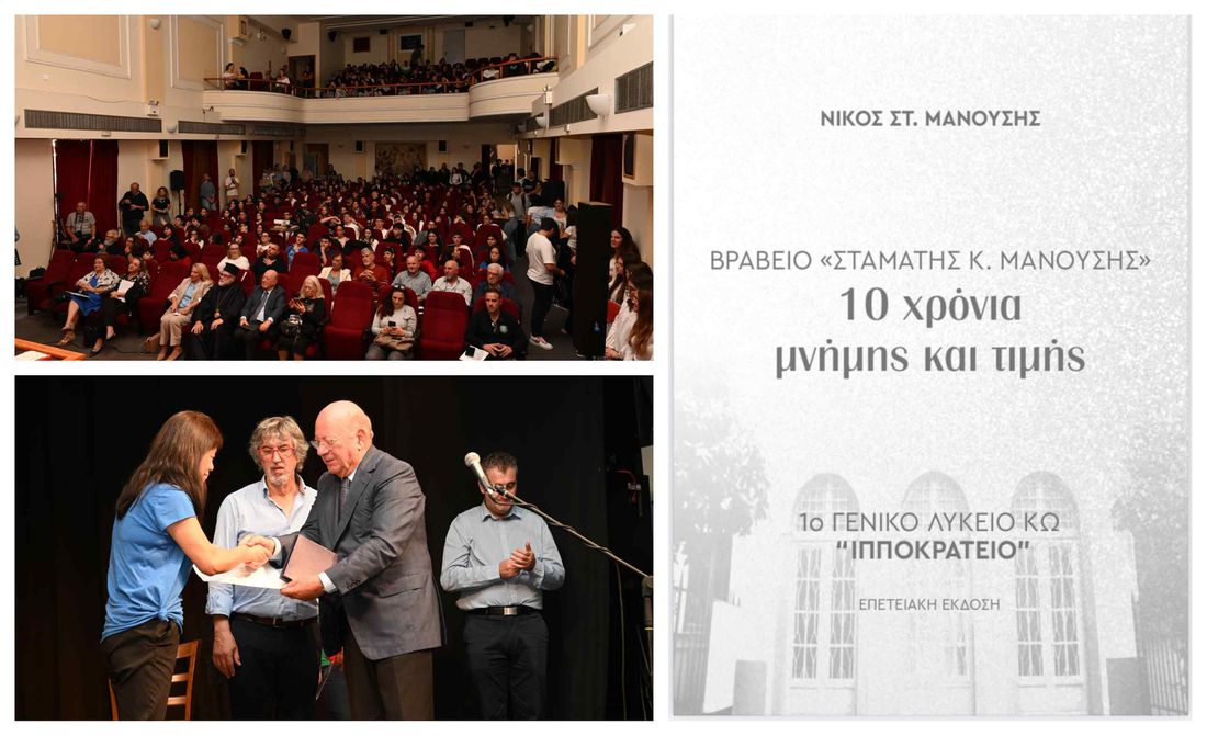 Σε κλίμα πανηγυρικό συγκίνησης και υπερηφάνειας πραγματοποιήθηκε στο 1ο Γενικό Λύκειο Κω «Ιπποκράτειο» η φετινή απονομή του βραβείου «Σταμάτης Κ. Μανούσης», που συμπληρώνει φέτος δέκα χρόνια συνεχούς παρουσίας. Η τελετή πραγματοποιήθηκε στο πλαίσιο του εορτασμού της 28ης Οκτωβρίου και τη συμπλήρωση 78 ετών από την επίσημη ενσωμάτωση των Δωδεκανήσων στην Ελλάδα, προσδίδοντας ιδιαίτερο συμβολισμό στη φετινή εκδήλωση.