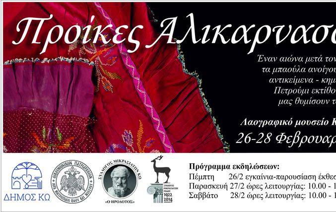 Οι σύλλογοι Μικρασιατών Ρόδου και Κω σε συνεργασία με την Μητρόπολη και τον Δήμο της Κω θα πραγματοποιήσουν στην Κω, στον χώρο του λαογραφικού μουσείου "Το Χάνι" την πρώτη έκθεση λαογραφικού υλικού από την Αλικαρνασσό. Δυό μπαούλα με την προίκα που έφερε η Μαρία Μαρκόγλου από απέναντι, μαζί με αντικείμενα από άλλες Πετρουμιανές οικογένειες θα παρουσιαστούν για τρεις μέρες. Τα εγκαίνια της έκθεσης θα γίνουν την Πέμπτη στις 18.00.