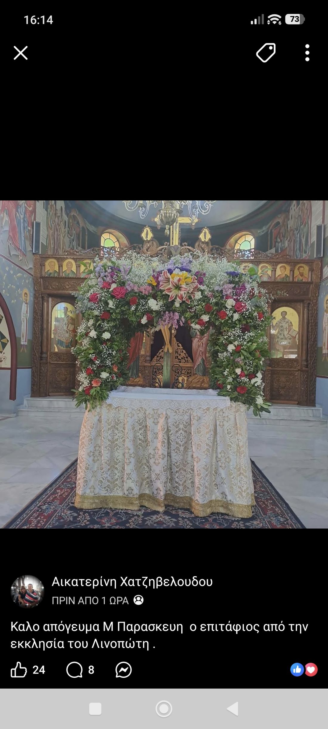 Τη Μεγάλη Πέμπτη, αμέσως μετά το πέρας της Ακολουθίας των Παθών, εκατοντάδες πιστοί συγκεντρώθηκαν στους ναούς, συμμετέχοντας με ευλάβεια και αγάπη στον στολισμό των Επιταφίων. Με φροντίδα και μεράκι, χρησιμοποίησαν πανέμορφα, πολύχρωμα και ευωδιαστά λουλούδια, δημιουργώντας εντυπωσιακές συνθέσεις.